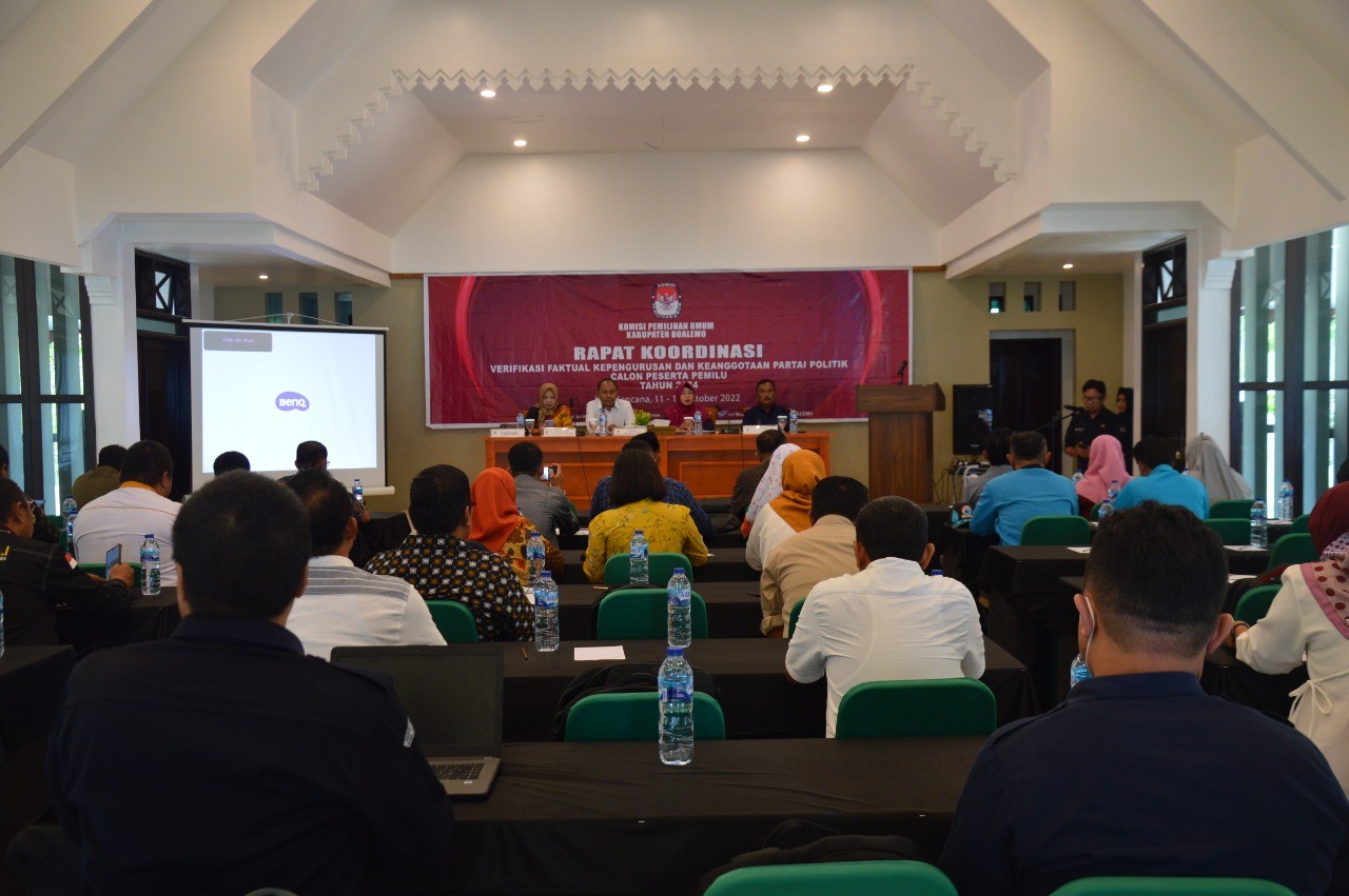 kab-boalemo.kpu.go.id, Untuk memperkuat pemahaman teknis jelang verifikasi faktual, Komisi Pemilihan Umum Kabupaten Boalemo menggelar Rapat koordinasi Verifikasi Faktual Kepengurusan dan Keanggotaan Partai Politik Calon Peserta Pemilu 2024 kepada Partai Politik se Kab Boalemo,di Villa Kencana Bolihutuo,Selasa 11 Oktober 2022