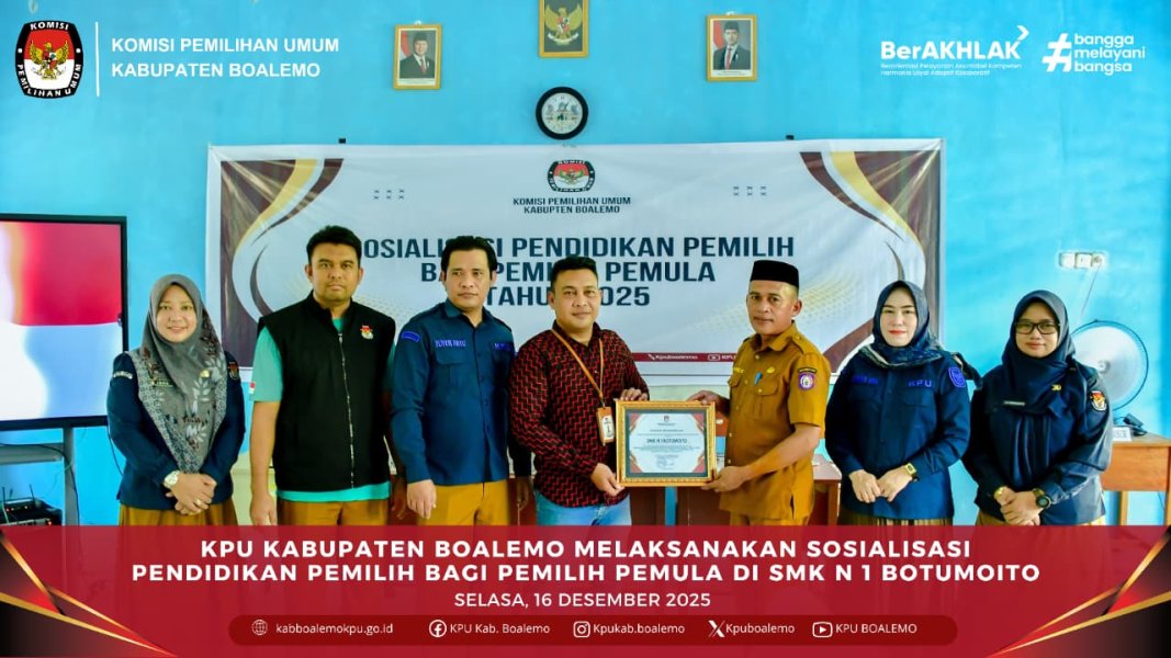 Boalemo - Komisi Pemilihan Umum (KPU) Kabupaten Boalemo melaksanakan kegiatan Sosialisasi Pendidikan Pemilih bagi Pemilih Pemula yang berlangsung di SMK Negeri 1 Botumoito, Selasa (16/12/2025). Kegiatan ini bertujuan untuk meningkatkan pemahaman dan kesadaran demokrasi di kalangan pelajar sebagai pemilih pemula.
