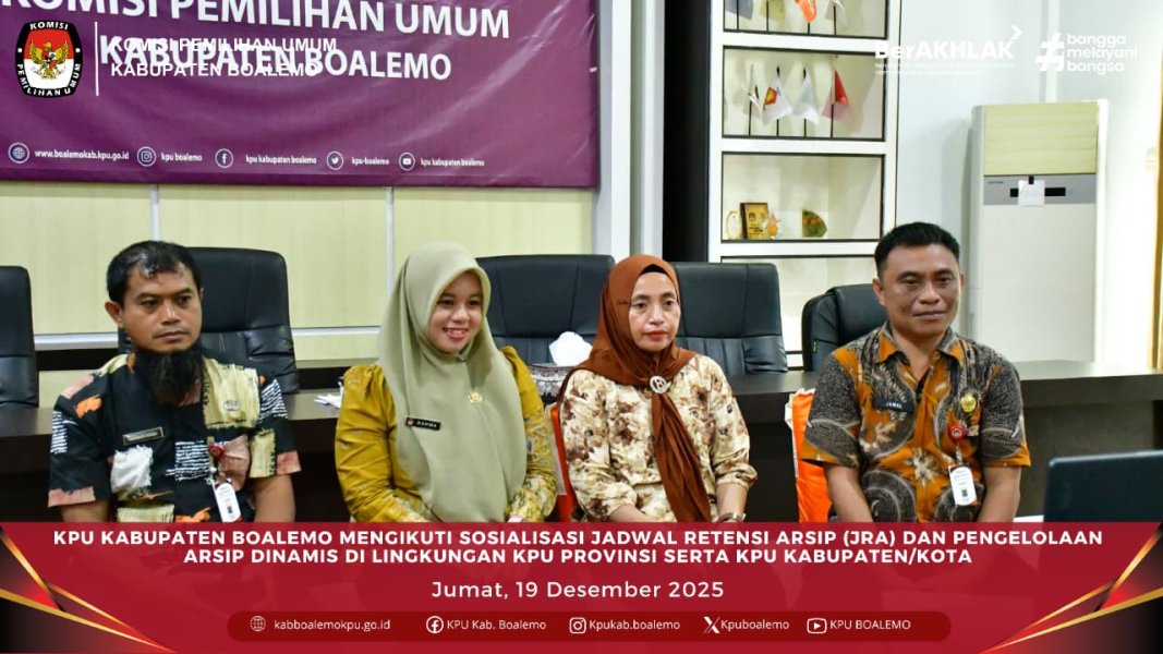 Boalemo - Komisi Pemilihan Umum (KPU) Kabupaten Boalemo mengikuti kegiatan Sosialisasi Jadwal Retensi Arsip (JRA) dan Pengelolaan Arsip Dinamis di lingkungan KPU Provinsi serta KPU Kabupaten/Kota yang diselenggarakan oleh KPU Republik Indonesia. Kegiatan ini dilaksanakan secara berani melalui Zoom Meeting pada Jumat, 19 Desember 2025.