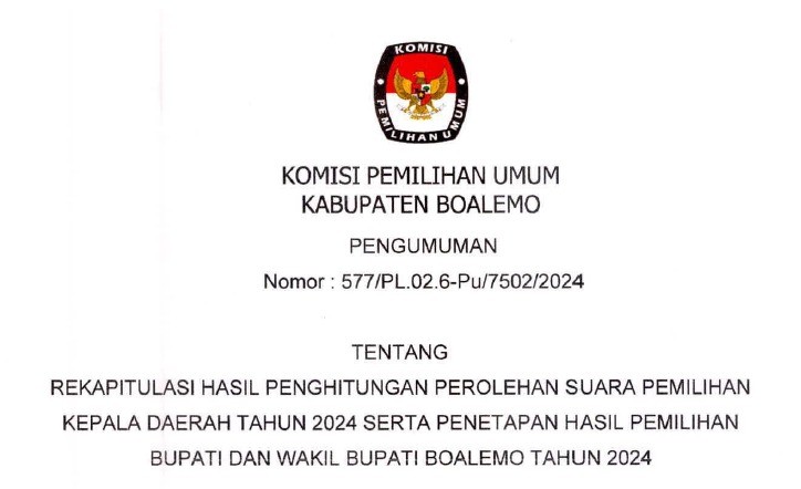 PENGUMUMAN REKAPITULASI HASIL PENGHITUNGAN PEROLEHAN SUARA PEMILIHAN KEPALA DAERAH TAHUN 2024 SERTA PENETAPAN HASIL PEMILIHAN BUPATI DAN WAKIL BUPATI BOALEMO TAHUN 2024
