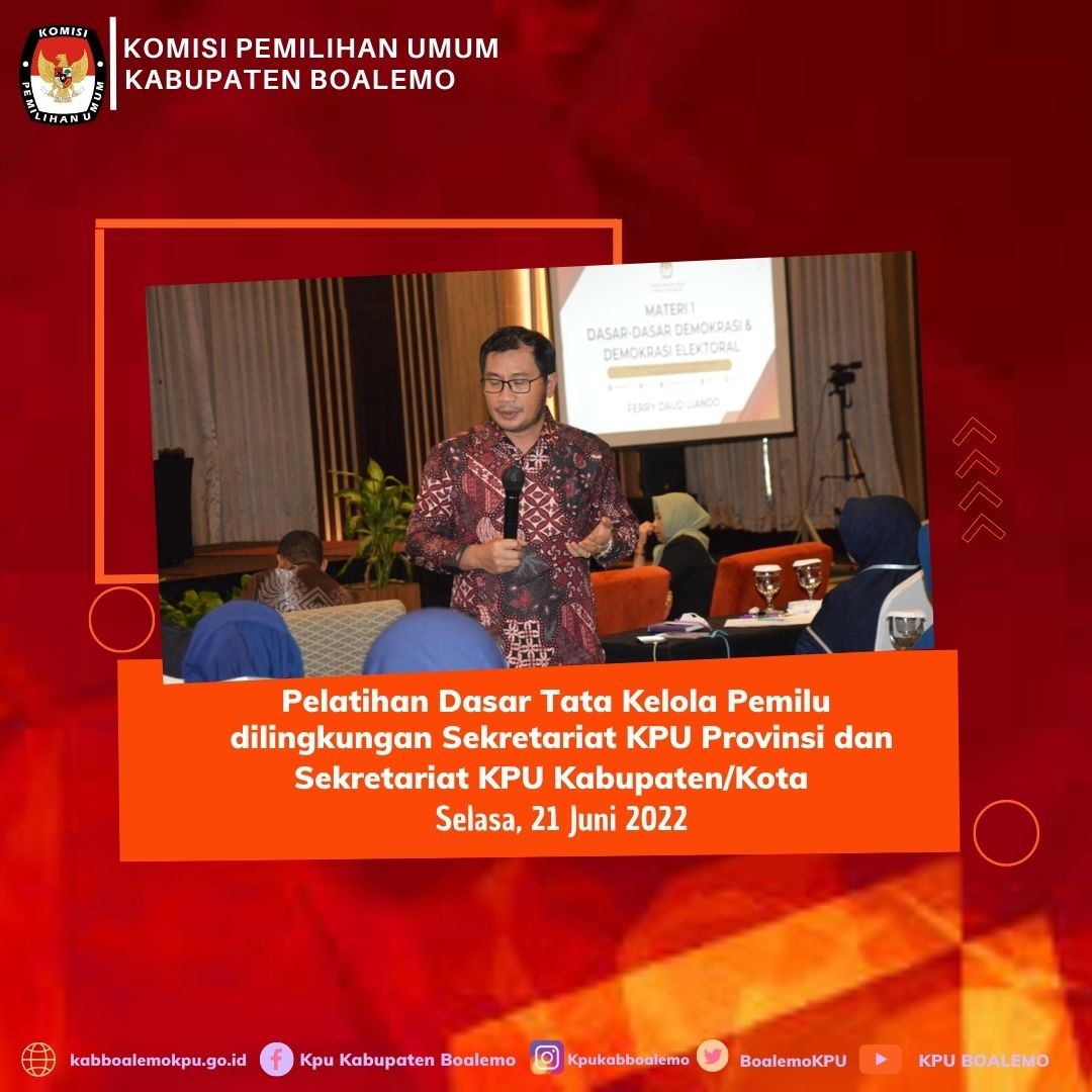 kab-boalemo.kpu.go.id . Sekretariat KPU Kab Boalemo mengikuti kegiatan Pelatihan Dasar Tata Kelola Pemilu, Selasa 21 Juni 2022. Bertempat di Hotel Aston Kota Gorontalo, pelatihan yang diselenggarakan oleh KPU Provinsi Gorontalo ini dihadiri oleh seluruh ASN Sekretariat KPU Kabupaten/Kota se-Provinsi Gorontalo. Kegiatan latsar Tata Kelola Pemilu salah satu tujuan adalah untuk memperkuat pemahaman bagi penyelenggara pemilu baik secara teknis dan administrasi,sebagai moderator pada kegiatan ini Santo dengan pembicara Pakar Pemilu KPU RI Ferry Daud Liando. Adapun materi yang disampaikan dalam pelatihan ini diantaranya adalah Dasar-Dasar Pemilu dan Demokrasi dan Kesekretariatan Penyelenggaraan Pemilu Independen. Selanjutnya disampaikan juga materi mengenai pembelajaran pengalaman dan studi kasus penyelenggaraan Pemilu di Indonesia. Menutup acara, dilaksanakan post test untuk mengukur pemahaman peserta pelatihan terhadap materi kepemiluan yang telah disampaikan. Pelatihan berakhir pukul 19.00 WIB dan ditutup secara resmi oleh Mukti Abdulatif Mile Sekretaris KPU Provinsi Gorontalo. #KPUMelayani #PemiluSerentak2024