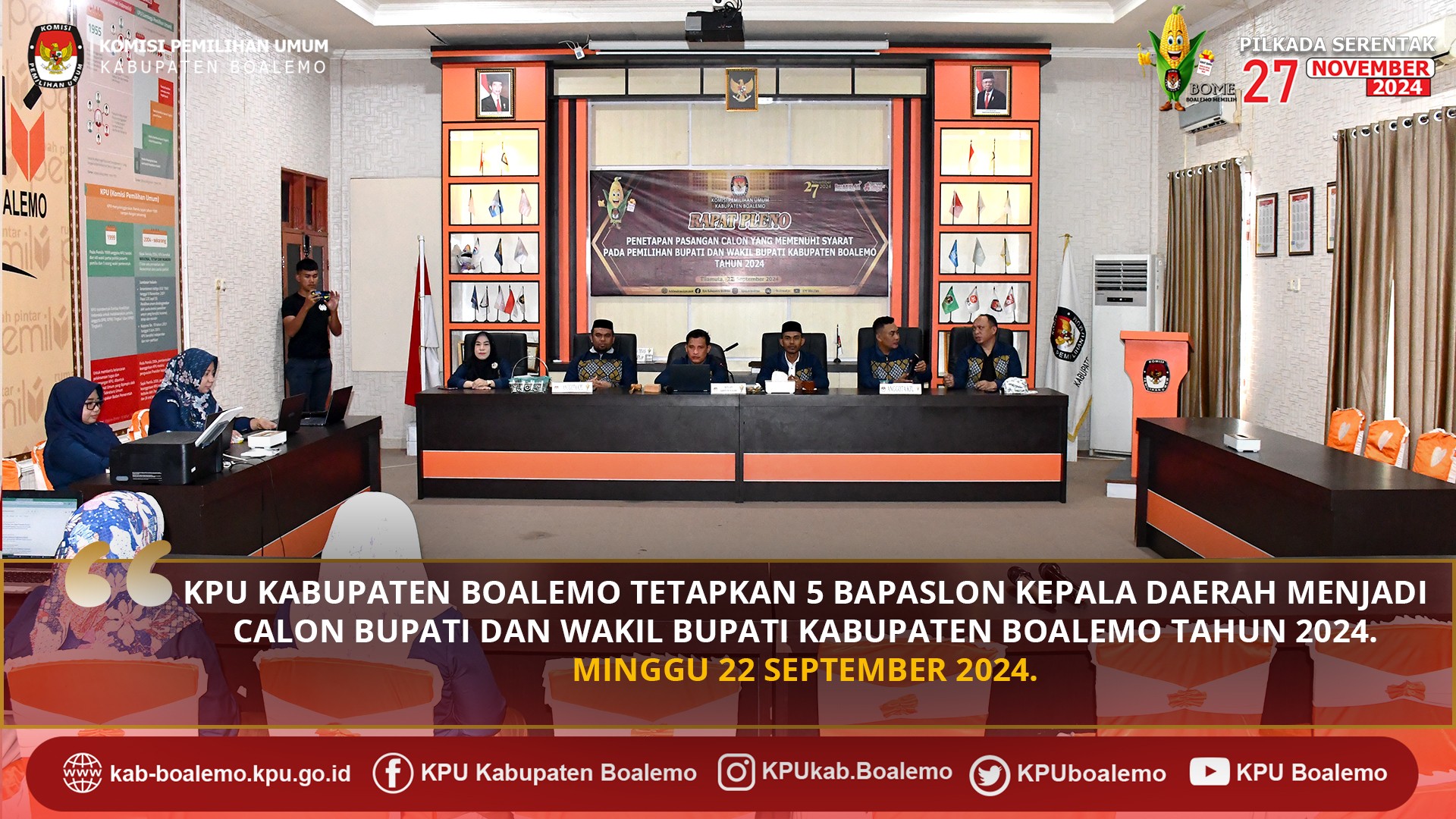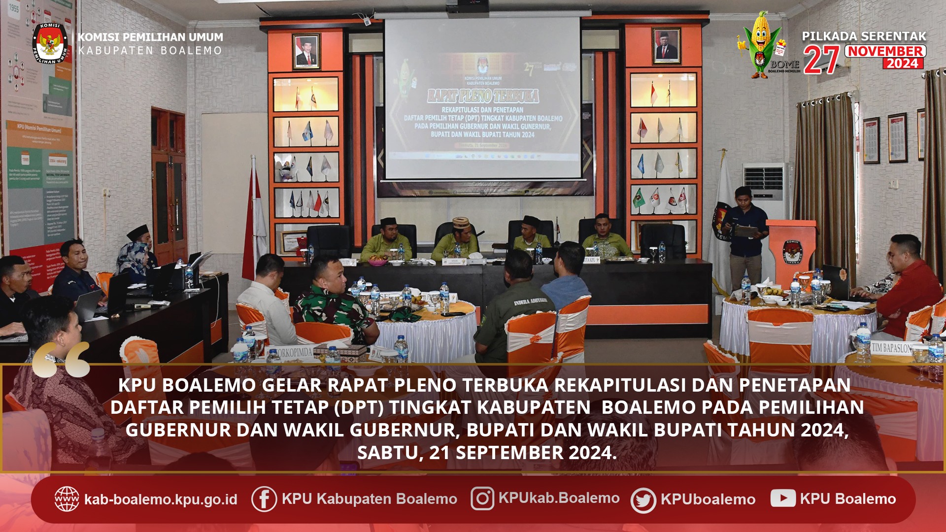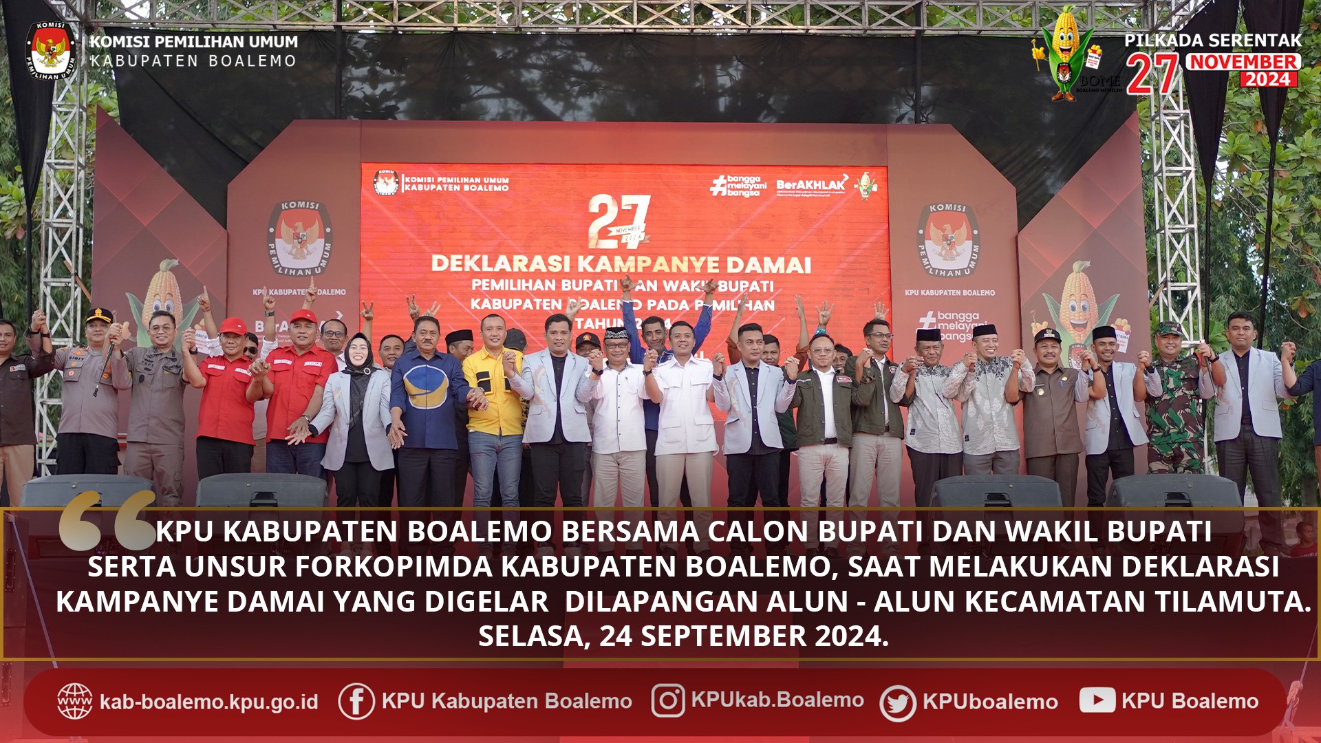 Kab. Boalemo – Sebelum memasuki tahapan kampanye oleh pasangan calon, Komisi Pemilihan Umum (KPU) Kabupaten Boalemo menggelar deklarasi kampanye damai yang diikuti oleh lima pasangan calon Bupati dan Wakil Bupati Kabupaten Boalemo, Selasa (24/9/2024) dilapangan Alun - Alun Kecamatan Tilamuta. Ketua Komisi Pemilihan Umum Kabupaten Boalemo Yuyun Antu, memimpin langsung deklarasi kampanye damai yang kemudian diikuti oleh seluruh pasangan calon. “hari ini kami melaksanakan kegiatan deklarasi kampanye damai, dimana kegiatan ini kami senagaja lakukan sebelum para pasangan calon melaksanakan tahapan kampanye” ujar Ketua KPU Yuyun Antu. Ada tiga point yang termuat dalam deklarasi yang dibacakan oleh seluruh pasangan calon, diamana keseluruhannya ini memuat ajakan untuk tetap menjaga persatuan dan kesatuan serta menekankan etika dalam menyampaikan program-program pada saat kampanye. “intinya kami mengajak seluruh pihak untuk bagaimana dalam melaksanakan kampanye etika, adab dan dalam menyampaikan kampanye tidak melakukan provokasi kepada masyarakat serta tidak menyampaikan hal yang belum tentu kebenarannya atau informasi hoax” jelas Yuyun. Dalam deklarasi kampanye damai ini, selain ketua dan pimpinan KPU Kabupaten Boalemo, juga hadir dalam kegiatan ini unsur forkopimda Boalemo. “kepada seluruh pihak yang hadir, baik itu pak bupati, Dandim 1316 Boalemo, Kapolres Boalemo pak Kajari kami dari KPU menyampaikan terima kasih, dan kami mohon dukungan dari seluruh pihak untuk bersama-sama mensukseskan pemilihan kepala daerah serentak tahun 2024” tandasnya. (Humas KPU Boalemo)
