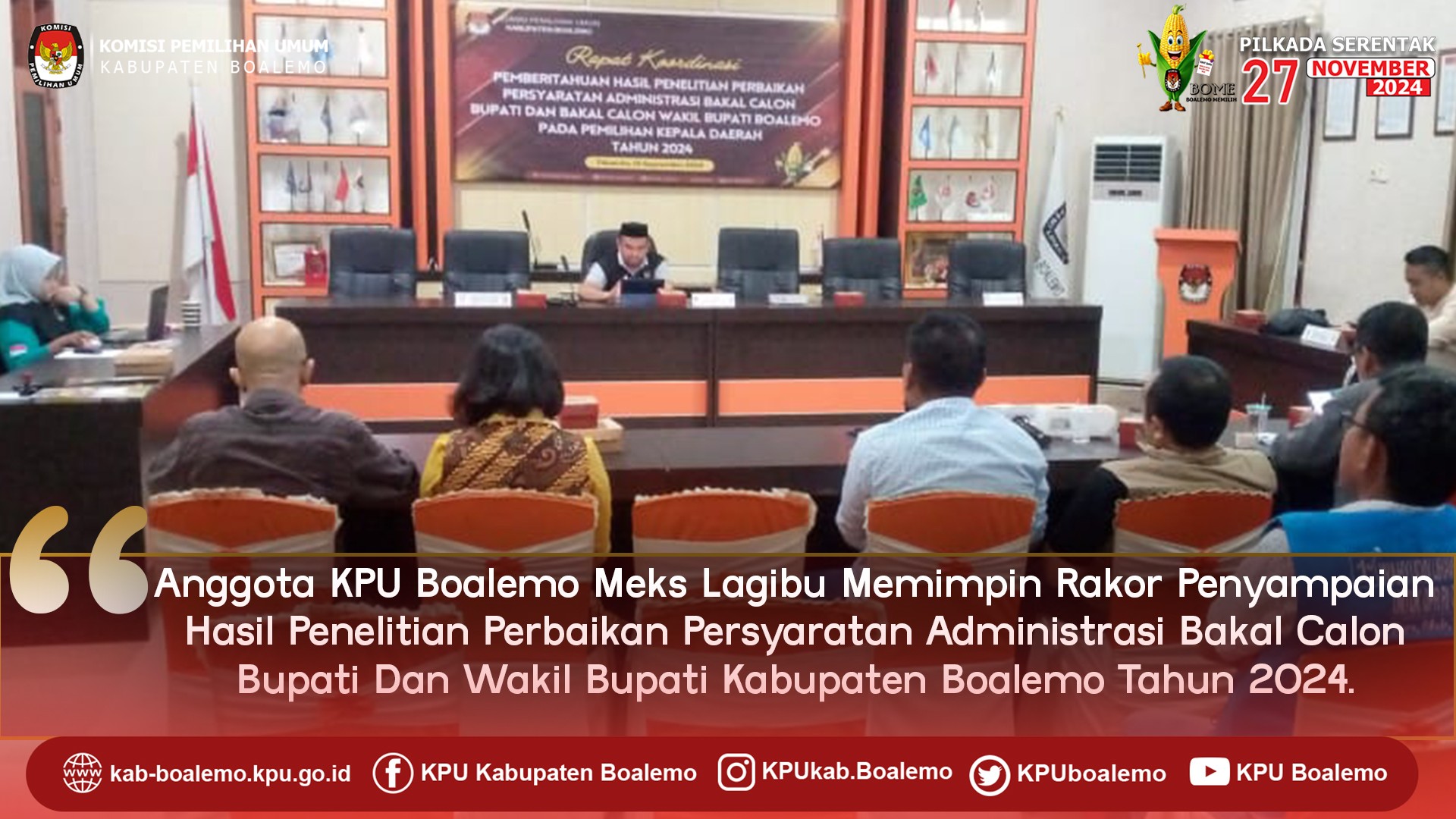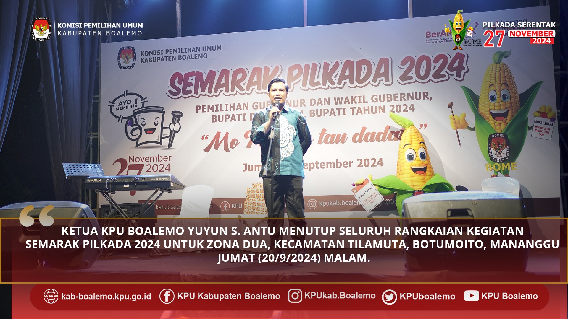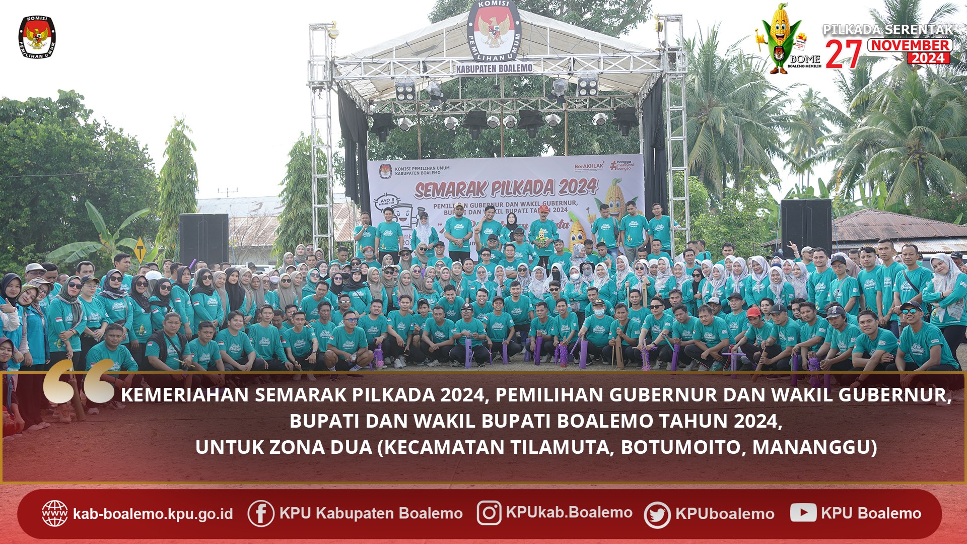 Kab. Boalemo - Komisi Pemilihan Umum (KPU) Boalemo kembali melaksanakan kirab dalam rangka semarak pilkada tahun 2024. Kali ini pelaksanaan kirab semarak pilkada digelar pada zona dua,Kecamatan Tilamuta, Botumoito, Mananggu, yang dipusatkan di lapangan hijau Kecamatanaggu, Jumat (20/9/2024). Kegiatan ini, dibuka langsung oleh ketua KPU Boalemo Yuyun S. Antu, serta dihadiri oleh anggota KPU Boalemo, Meks Lagibu, Ali Sahap dan Febriyani Selvia Biya serta sekretariat KPU Boalemo, para Camat, PPK dan PPS yang ada di tiga kecamatan. "hari ini merupakan kegiatan kedua yang kita laksanakan, setelah sebelumnya kita menggelar kegiatan serupa di Kecamatan Paguyaman" ucap Yuyun Antu. Kegiatan semarak pilkada dengan tema "mo poota to tau dadata" diisi dengan sejumlah kegiatan olahraga bersama serta lomba yang diikuti oleh PPK maupun PPS dari tiga kecamatan, baik Tilamuta, Mananggu dan Botumoito. "sebagaimana tema kita pada kirab pilkada ini, yakni menginformasikan kepada publik bahwa pelaksanaan pilkada di Kabupaten Boalemo sementara berjalan" terang Ketua KPU yuyun Antu. "dan tanggal 25 dibulan ini, dimulainya pelaksanaan kampanye, sehingganya harapan kami, semua berpartisipasi aktif dalam mensukeskan pelaksanan pilkada" tutup Yuyun Antu. (Humas KPU Boalemo)