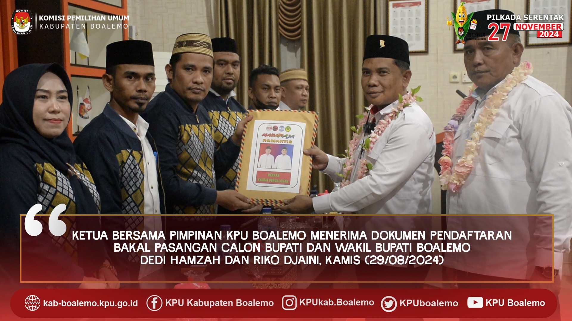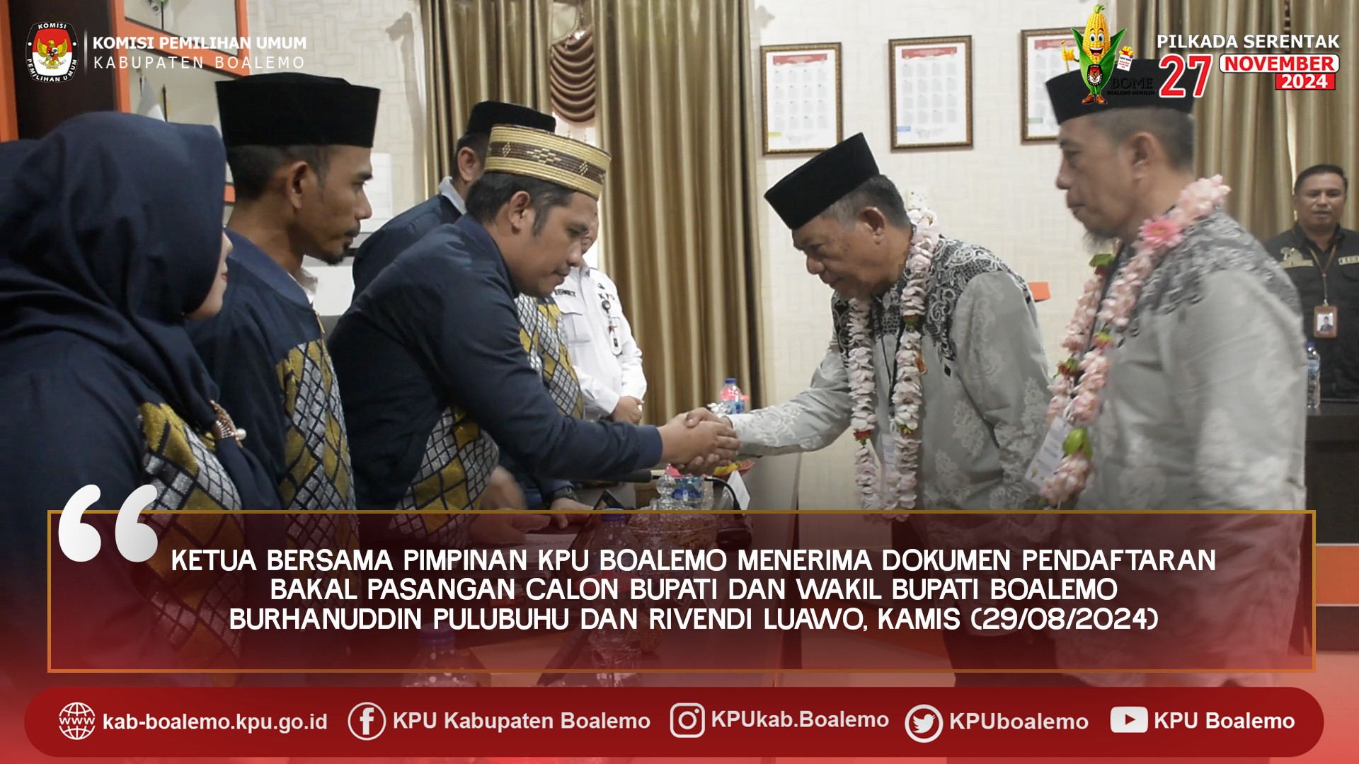 KPU Boalemo – Dihari ketiga tahapan pendaftaran bakal pasangan calon kepala daerah, Komisi Pemilihan Umum (KPU) Boalemo menerima pendaftaran bakal pasangan calon. Pasangan yang menjadi pendaftar pertama dihari ketiga ini yakni pasangan Burhanuddin Pulubuhu dan Rivendi Luawo. “hari ini, kami menerima lagi bakal pasangan calon yang mendaftar yakni bapak Burhanuddin Pulubuhu dan Rivendi Luawo” ucap Ketua KPU Boalemo Yuyun Antu usai menerima dokumen pendaftaran di kantor KPU Boalemo, Kamis (29/8/2024). Usai menerima dan melakukan pemeriksaan dokumen syarat pendaftaran bakal pasangan calon, KPU Boalemo menyatakan dokumen yang masukan keduanya lengkap dan resmi diterima KPU. “sudah kami terima dan kami periksa, dokumennya lengkap, dan kami nyatakan diterima” kata Yuyun Antu. Bapaslon Burhanudin Pulubuhu dan Rivendi Luawo sendiri, menjadi satu-satunya bapaslon yang mendaftar di KPU yang berasal dari calon perseorangan. “iya, untuk pak Burhanuddin dan Rivendi Luawo, itu dari calon perseorangan kemarin sudah kita nyatakan memenuhi syarat untuk syarat dukungan bakal calon perseorangan” jelas Ketua KPU. Sebagai pelaksana undang-undang dalam melaksanakan administrasi proses dan hasil pemilu KPU Kabupaten Boalemo berkomitmen akan melaksanakan tugas dan tanggung jawab sesuai dengan ketentuan yang berlaku. “dalam proses pengadministrasian, kami KPU Boalemo menjamin hak konstitusi setiap warga negara lewat proses pengadministrasian, baik itu pengadministrasian pemilih, dan pengadministrasian hak konstitusi dalam hal ini peserta pilkada” Tandasnya. (Humas KPU Boalemo)