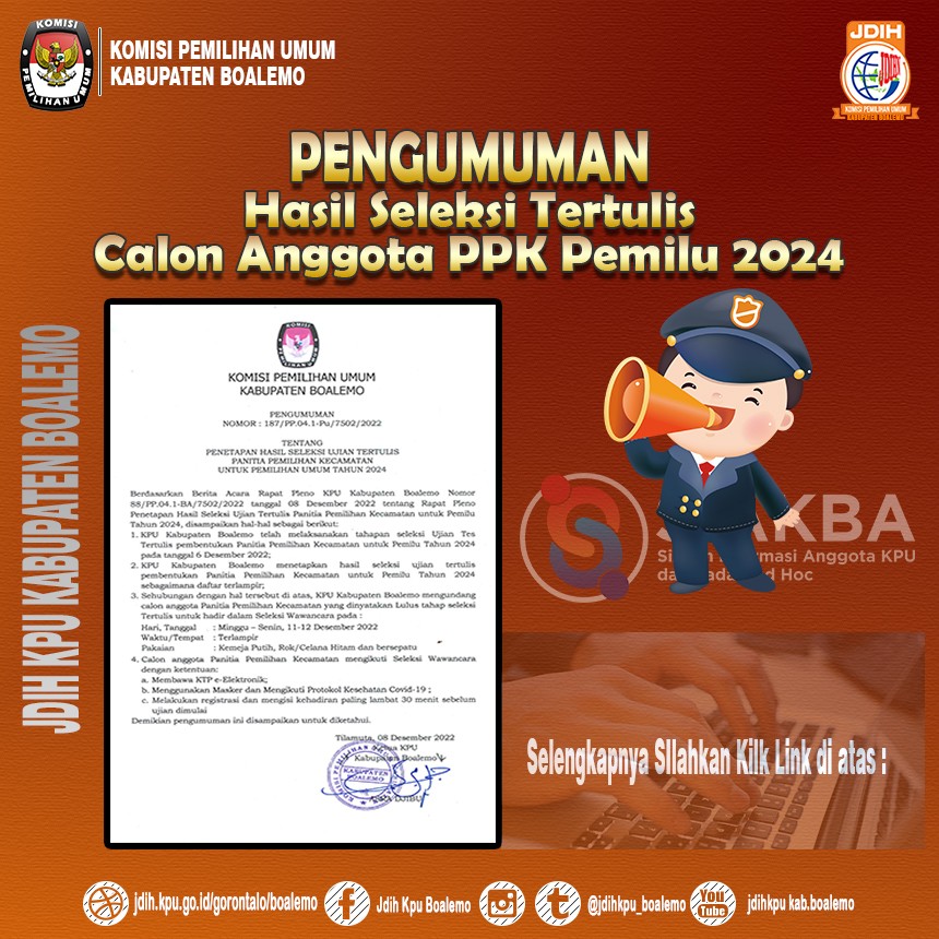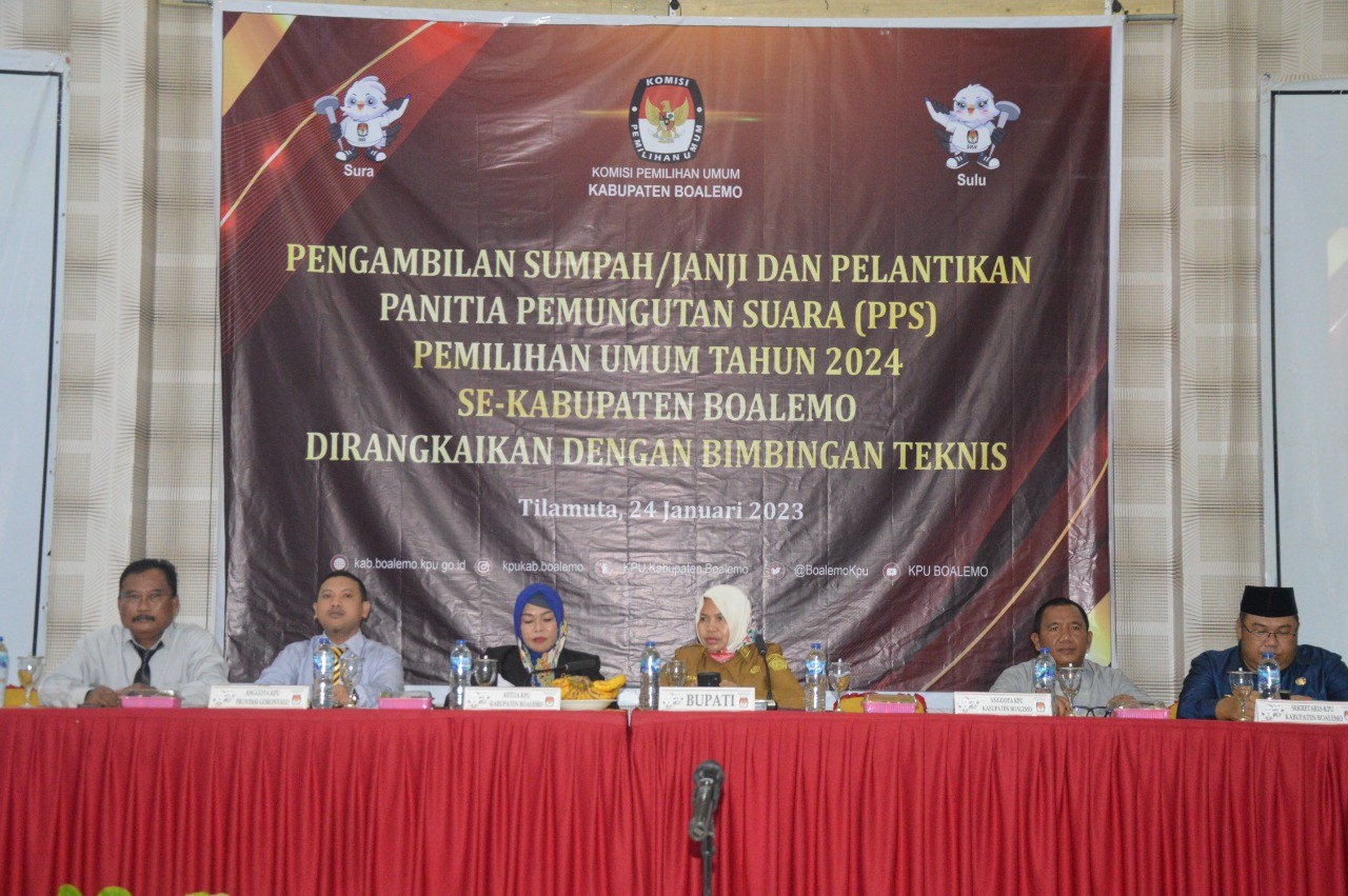 kab-boalemo.kpu.go.id,Sebanyak 246 Panitia Pemungutan Suara (PPS) Pemilu tahun 2024 se Kabupaten Boalemo resmi dilantik dan di ambil sumpah oleh Ketua Komisi Pemilihan Umum Kab Boalemo, Asra Djibu, yang di laksanakan di Hotel Putra Tunggal ,Rabu (24/1/2023). “Dalam sambutannya, ketua Komisi Pemilihan Umum Kabupaten Boalemo Asra Djibu menyampaikan Pelantikan PPS kali ini menjadi demikian penting dan strategis, terutama dalam penyiapan seluruh personil yang akan terlibat dalam penyelenggaraan agenda Pemilihan Umum Serentak Tahun 2024 mendatang. “Asra pun menambahkan Anda semua sebagai anggota PPS saat ini adalah orang-orang terpilih karena anda telah melewati seleksi administrasi,tes tertulis dan tes wawancara. Dari hasil rangkaian tes yang telah dilaksanakan maka di peroleh 246 orang yang akan bekerja membantu KPU. “Tak Lupa saya Ucapkan selamat menjalankan tugas dengan rasa tanggung jawab dan tetap pertahankan integritas. ‘setelah dilaksanakan pelantikan dan pengambilan sumbah janji dilanjutkan dengan bimbingan teknis kepada seluruh anggota PPS, materi bimtek dan pembekalan Anggota PPS mengenai Tugas,wewenang dan kewajiban PPS dalam pelaksanaan tahapan penyelenggara Pemilu Tahun 2024. Turut hadir dalam kegiatan pelantikan dan pengambilan sumpah PPS dari Unsur Forkopimda dan Camat Se Kab Boalemo. #HumasKPUBoalemo