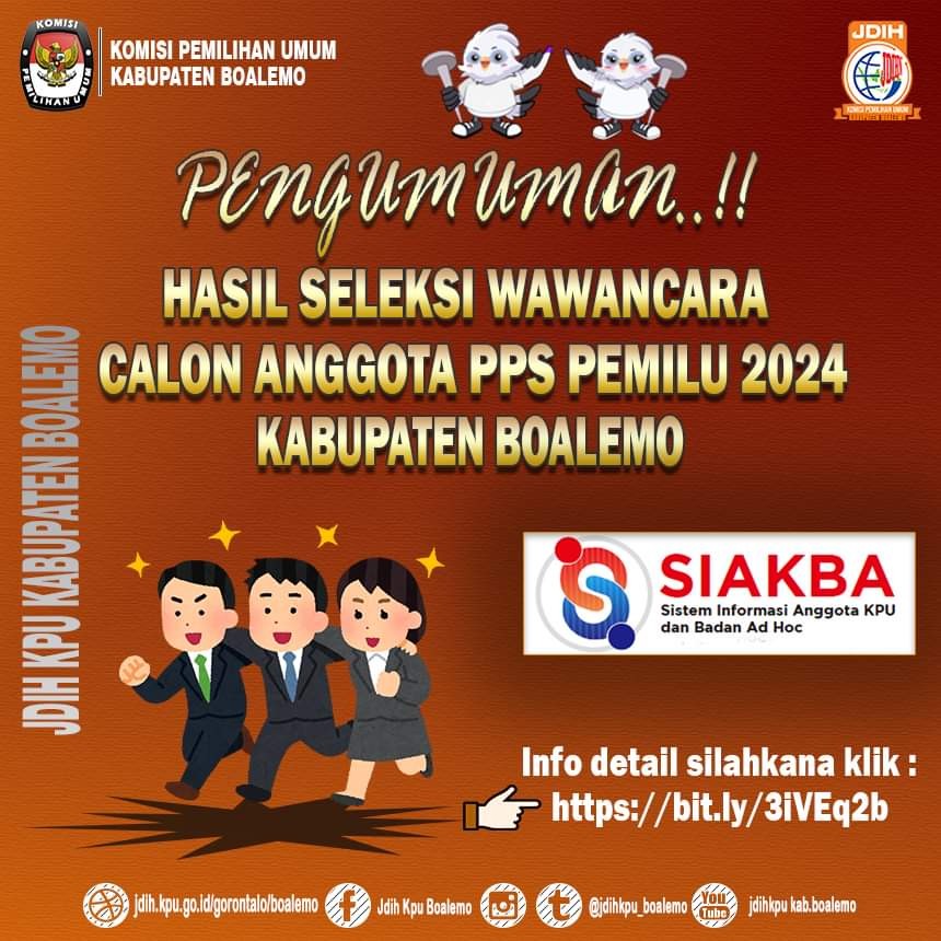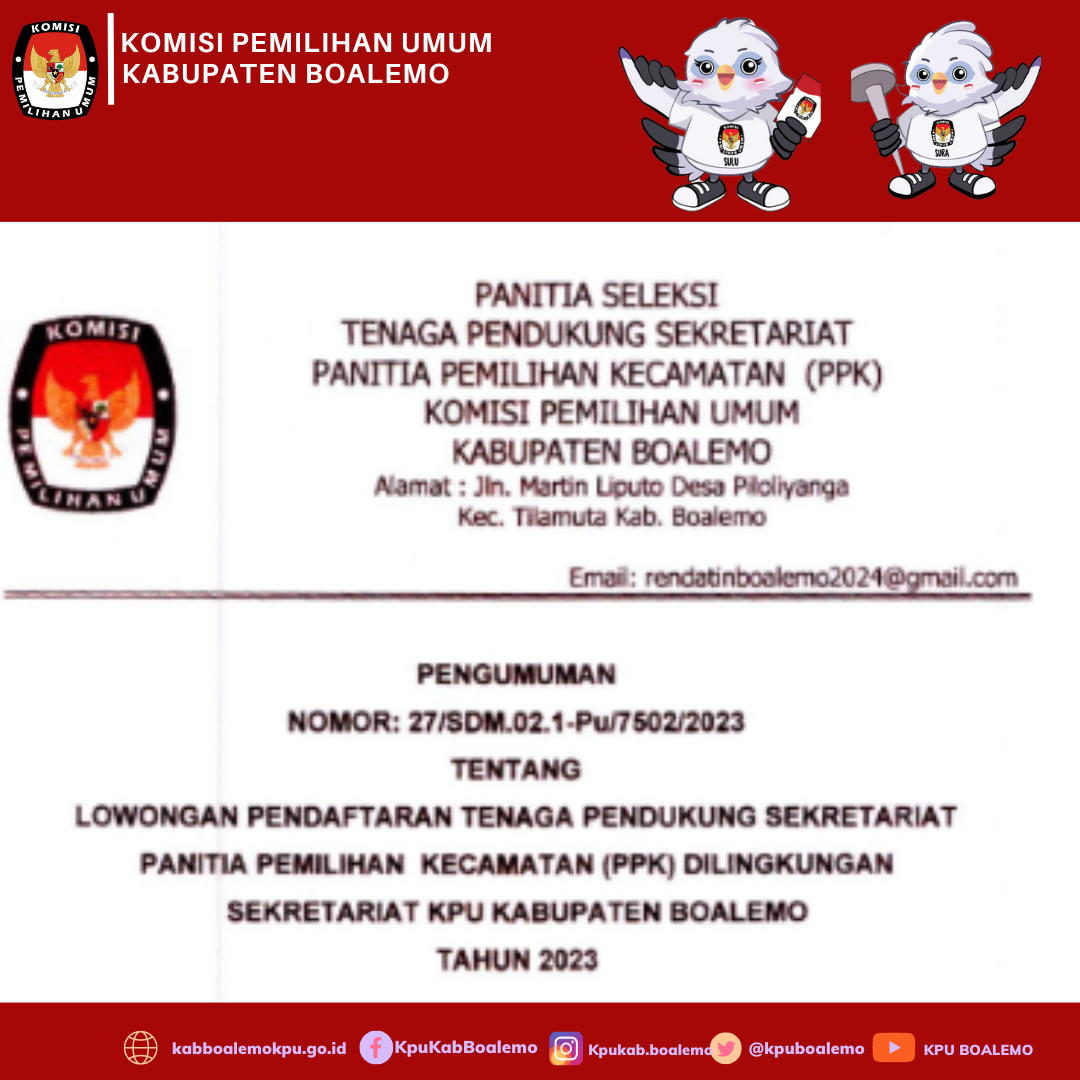 Sehubungan dengan terbitnya Keputusan Komisi Pemilihan Umum Nomor 534 Tahun 2022 tentang Perubahan atas Keputusan Komisi Pemilihan Umum Nomor 476 Tahun 2022 tentang Pedoman Teknis Pembentukan Badan Adhoc Penyelenggara Pemilihan Umum dan Pemilihan Gubernur dan Wakil Gubernur, Bupati dan Wakil Bupati, dan Walikota dan Wakil Walikota yang mengatur mengenai peruahan jadwal pembentukan PPS di dalamnya dengan ini, KPU Kabupaten Boalemo menyampaikan hal-hal sebagai berikut: